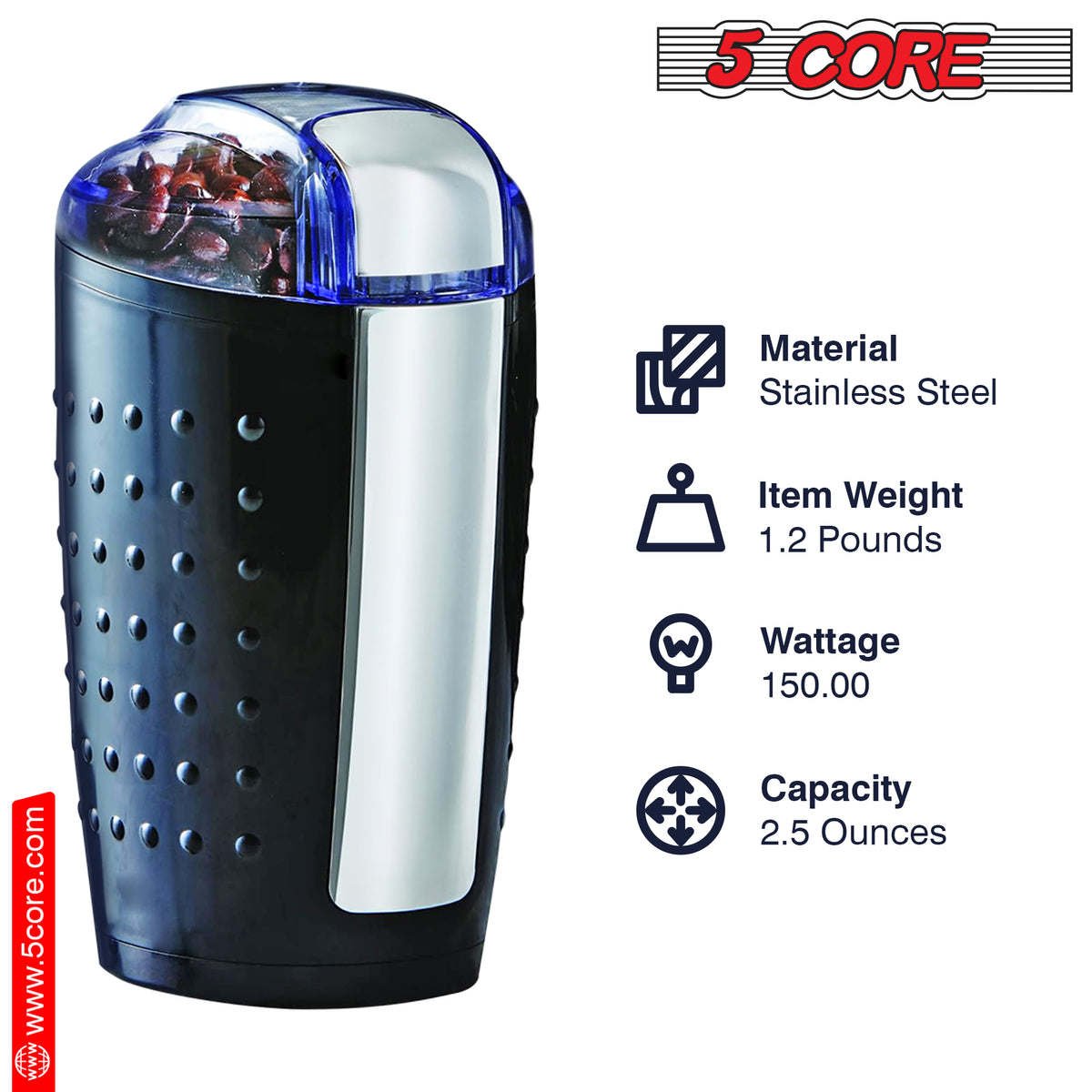 Home > 5 Core Coffee Grinder • 85 Gram Or 3 Ounces / 12 Cup Capacity • One-Touch Automatic Electric Bean Spice Grinding Machine • 150W Copper Motor • Stainle