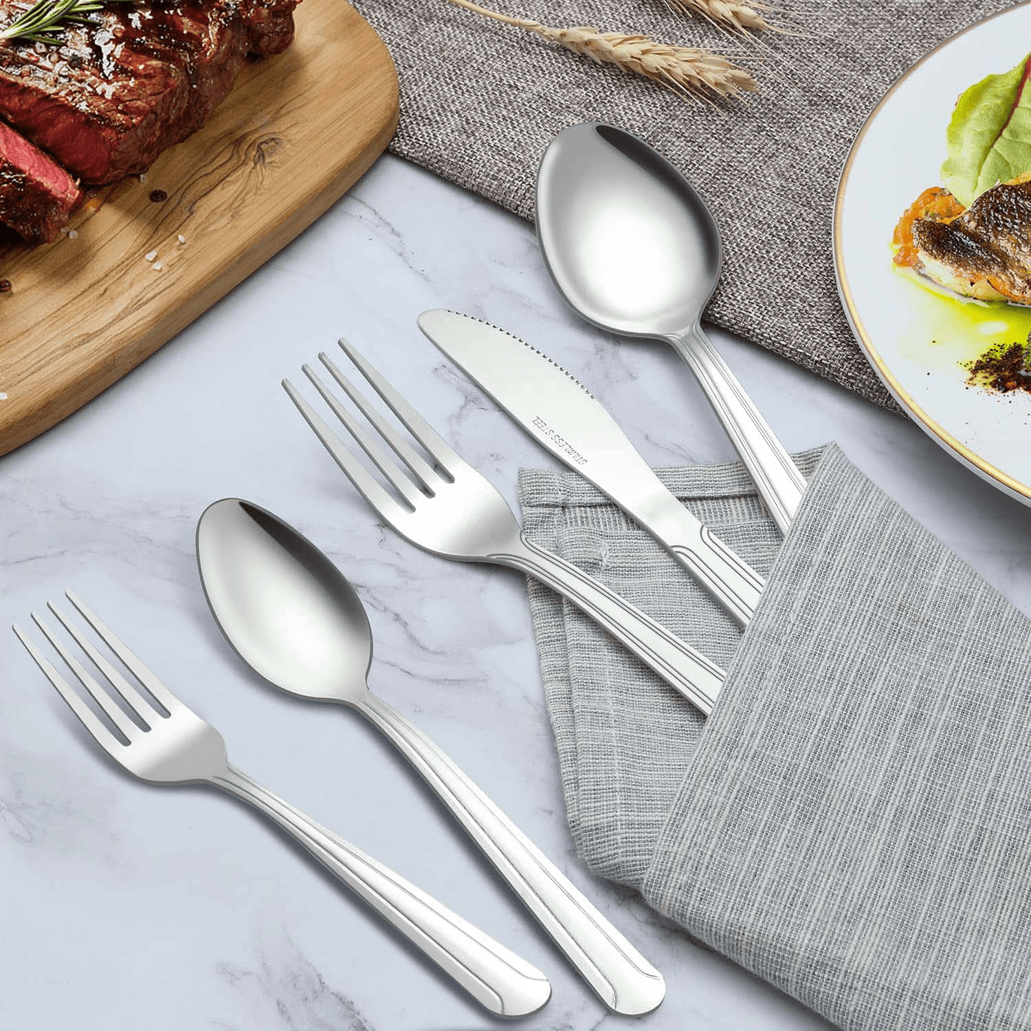 The good set of silverware can enhance the dining experience. If you are looking for a simple and classic cutlery set, then you have come to the right place! You won't regret taking this stainless steel flatware sets and serving food with them. The bestdin polish stainless steel flatware set will stand out in any tabletop setting! This attractive flatware set includes 12 dinner spoons, 12 dinner knives, 12 dinner forks, 12 salad forks, 12 teaspoons, and service for 12. The 60 pieces flatware set is great for everyday use. The sleek, classic lines of the design are so wonderful. This set can look laid back and cool with casual white plates. What we love about this refined collection is that it's dishwasher safe, so no pretense here. You can use it for special occasions and every day as well. It's absolutely a good silverware set to serve a family, entertaining guests or hosting a party, holiday meal, wedding, etc.This model is classic. It can be an accessory to any beautiful dinnerware that you have. Well-balanced and ergonomically designed. Every detail has been carefully polished, delicately designed, and produced. This promises to become your dinner plate's best companion!