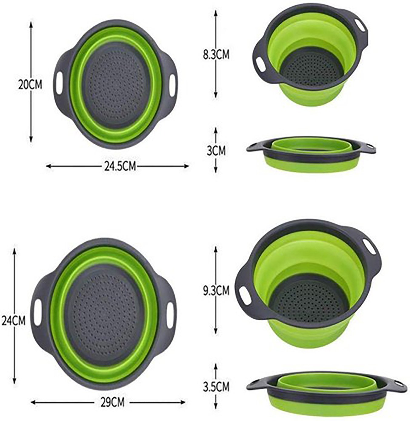 3.Two different size strainers are foldable with space-saving design, kitchen cabinet friendly, stores easily in small kitchen spaces, takes less than 1/4 the space of a traditional colander. Can be hung on a hook using one of the side handles.