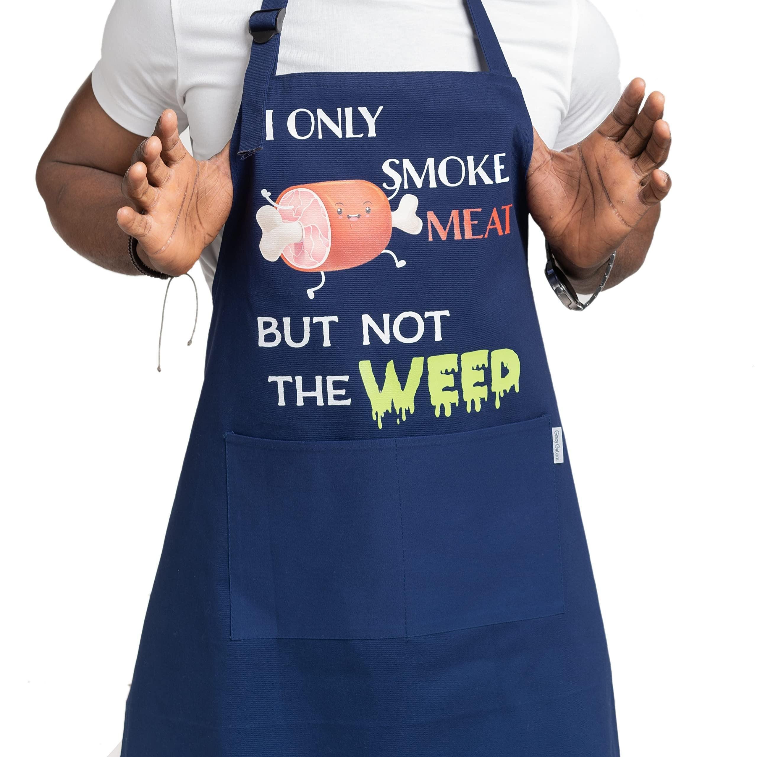 2.function and comfort - smoke meat not weed marijuana apron has adjustable neck and waist straps, which makes it universal for any size and suits both men and women. mens cooking apron funny comes with 2 large pockets, which are convenient for carrying kitchen utensils while baking a pie or barbequing.