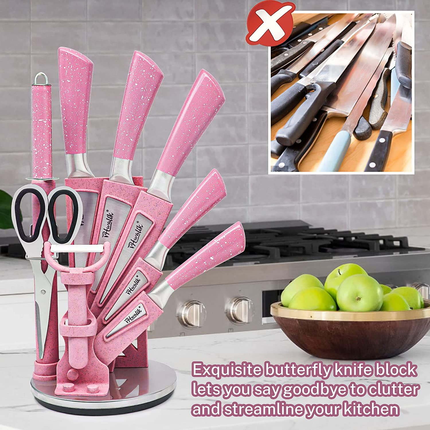 [All-in-one Knife Set ] Our pink stainless steel knife set comes with 5 professional knives for excellent precision cutting. It includes a stylish acrylic stand that is easy to place knives and convenient to recognize which knife you need. It also comes with a sharpener, a peeler and scissors. Convenient and durable for your kitchen.