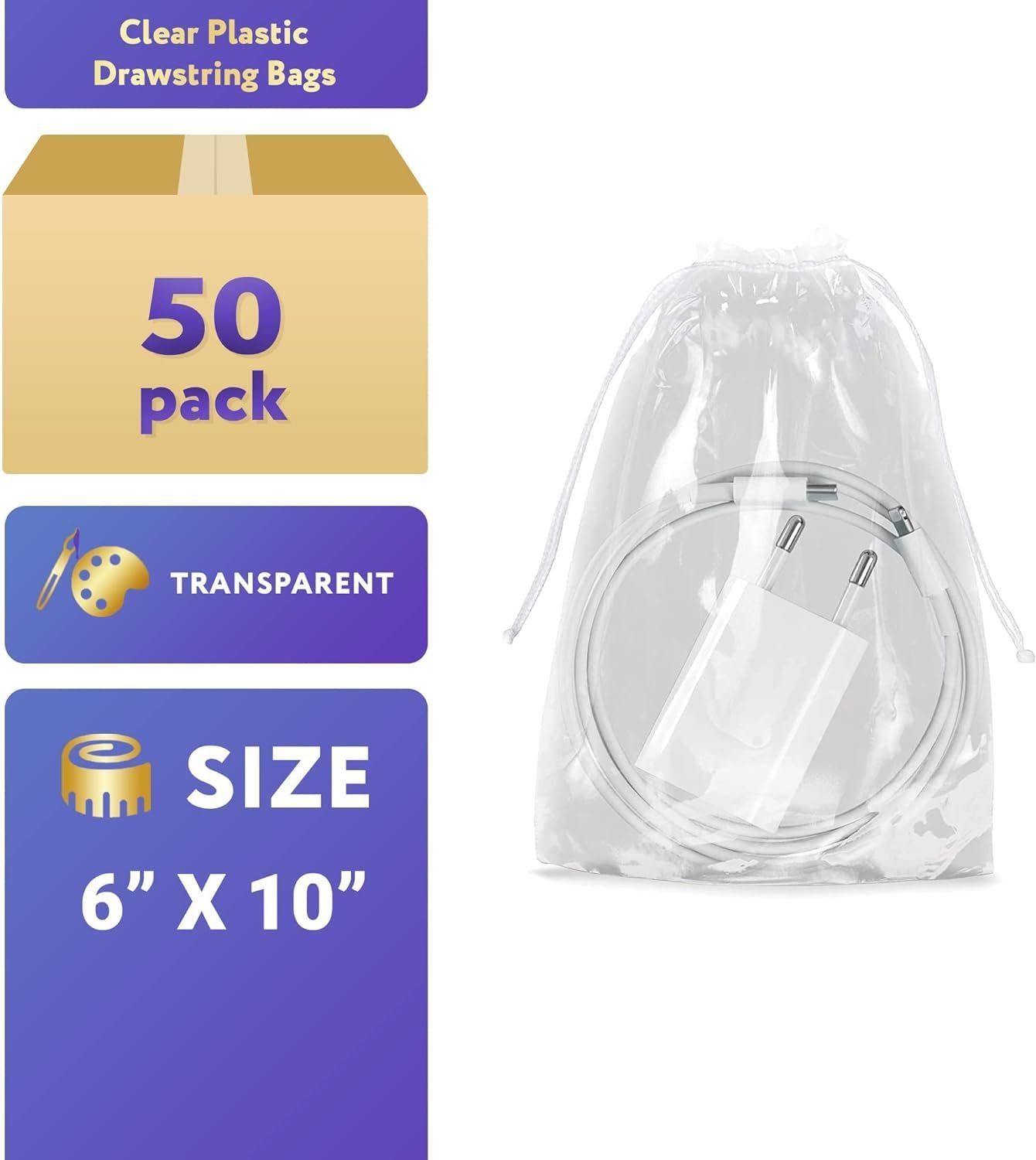 Pack of 50 Clear Drawstring Bags 6 x 10. Double Cotton Drawstrings Polyethylene Bags 6x10. Thickness 2 mil. Plastic Bags for Packing and Storing. Idea