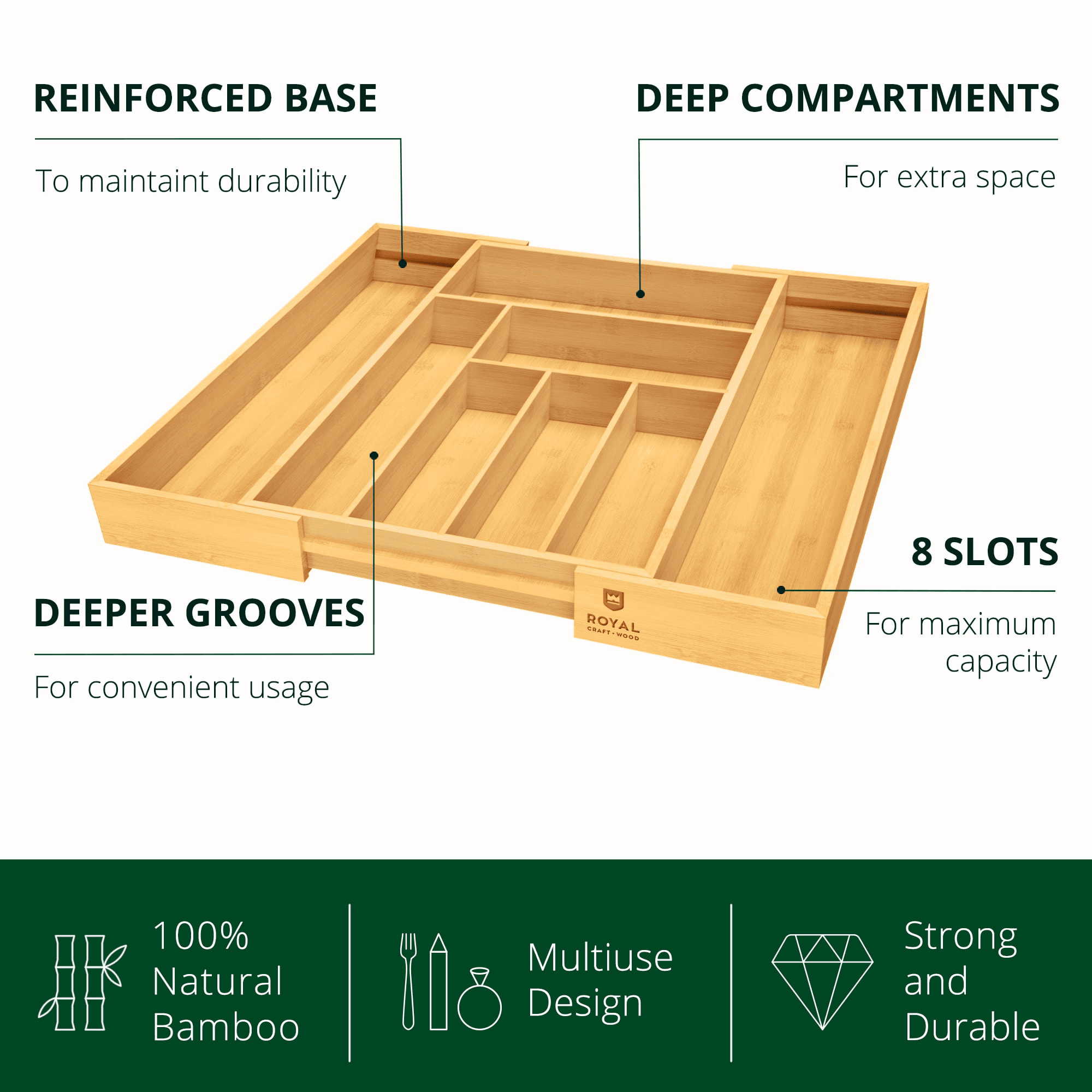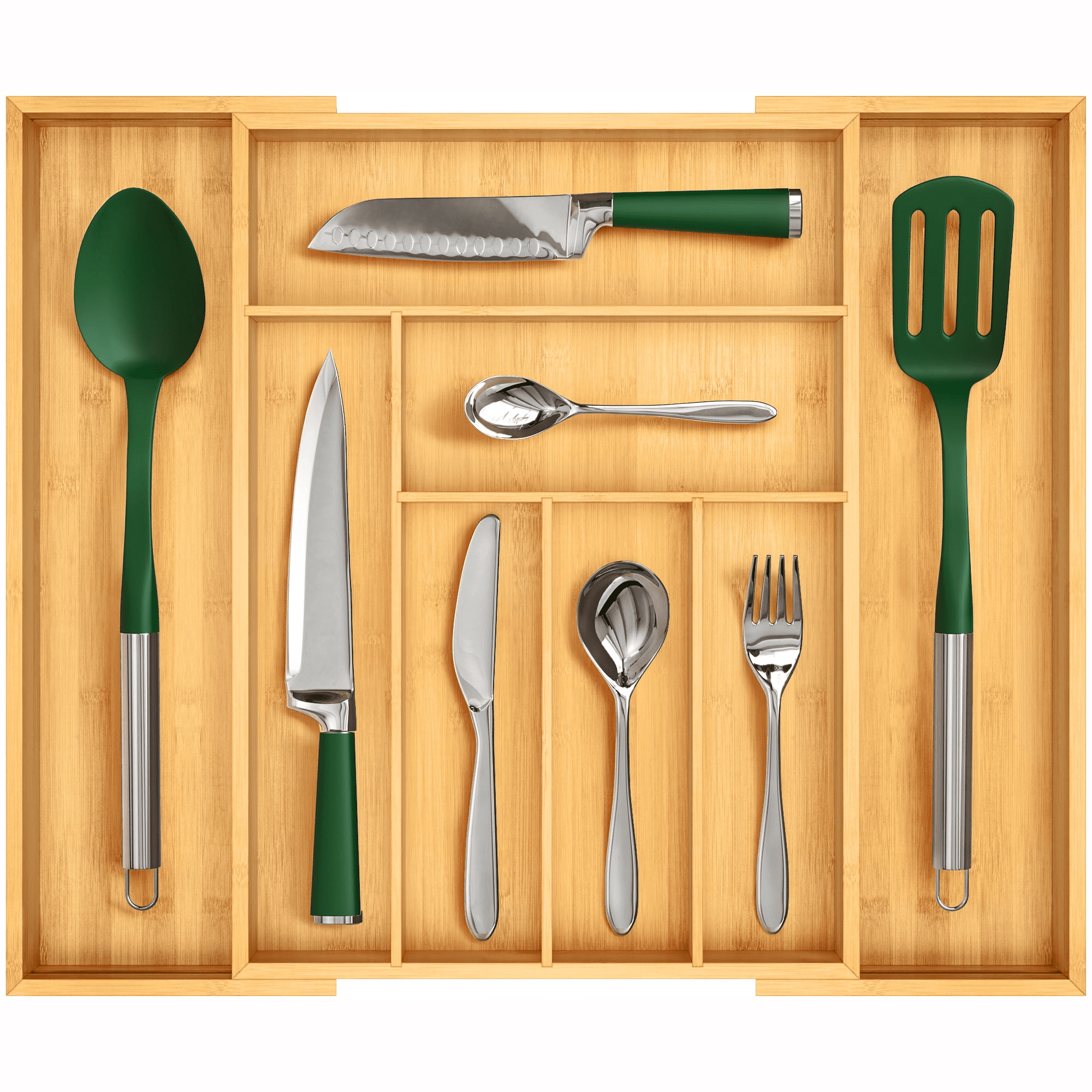 ✅ clutter free storage: our cutlery organizer is great not only for storing flatware, but also as a kitchen drawer organizer for large utensils such as spatulas, tongs, ladles, and more. Find all your kitchen gadgets in one spot and hassle free thanks to our organizers tall compartment walls. Take advantage of our beautiful bamboo organizers expandability and