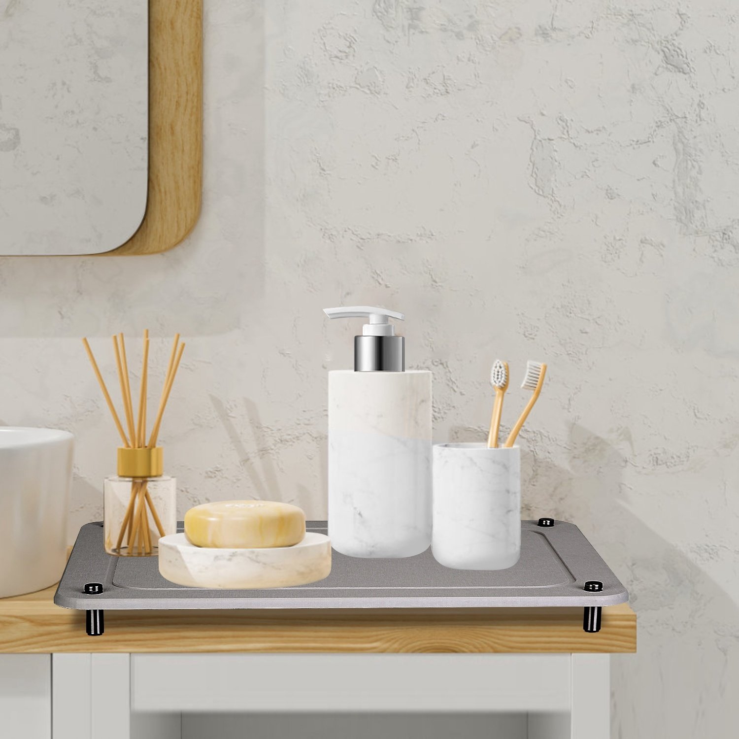 *Anti-Slip & Raised Feet*:Comes with 4Pcs stainless steel screw legs with anti-slip rubber pads,the Absorbing Stone Dish Drying Mat is not easy to slip even on wet countertop,and the raised feet can promote airflow.
