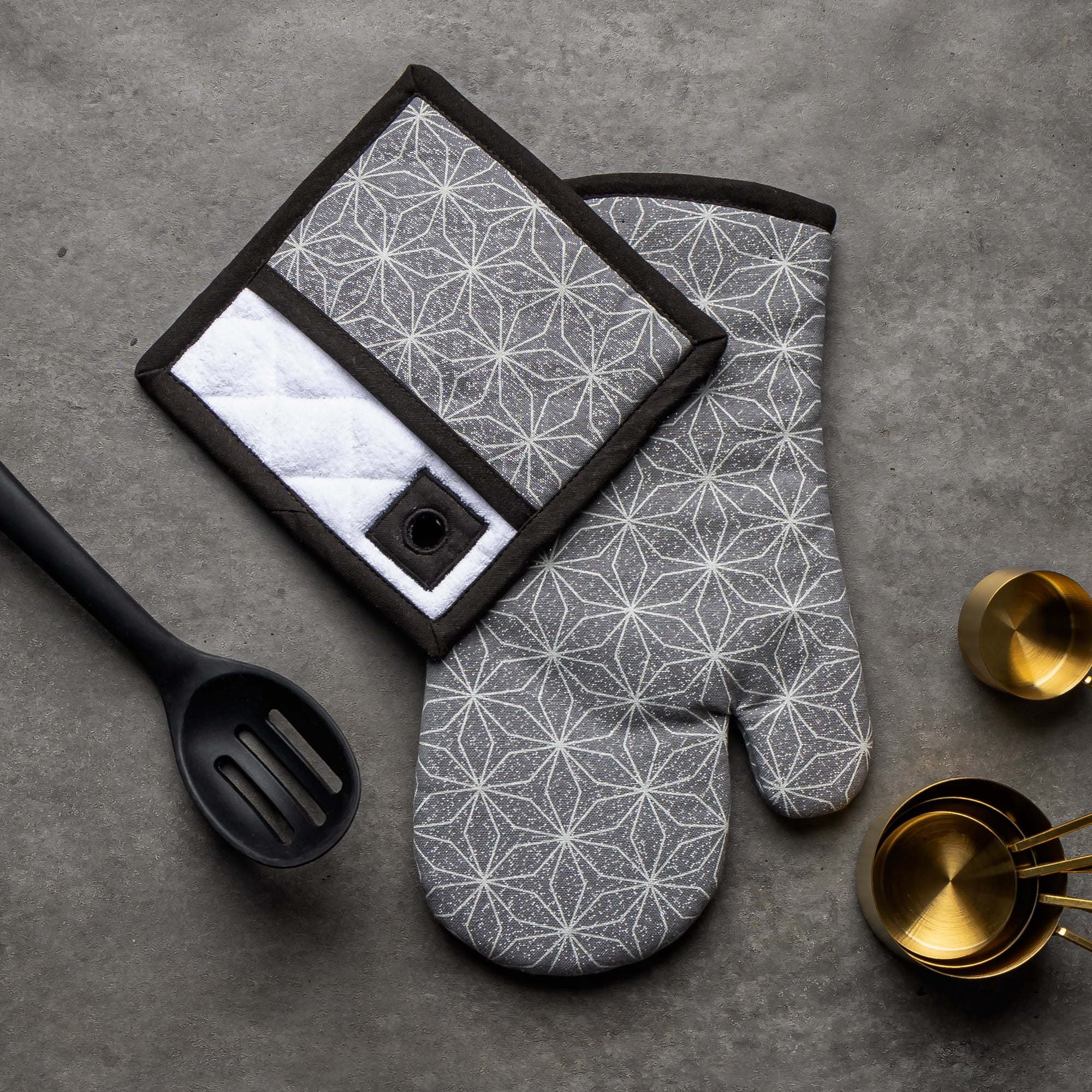 Thyme & Table 2-Pack Kitchen Set Oven Mit and Pot Holder, Gray Star Thyme & Table 2-Pack Kitchen Set Oven Mit and Pot Holder, Gray Star Thyme & Table 2-Pack Kitchen Set Oven Mit and Pot Holder, Gray Star